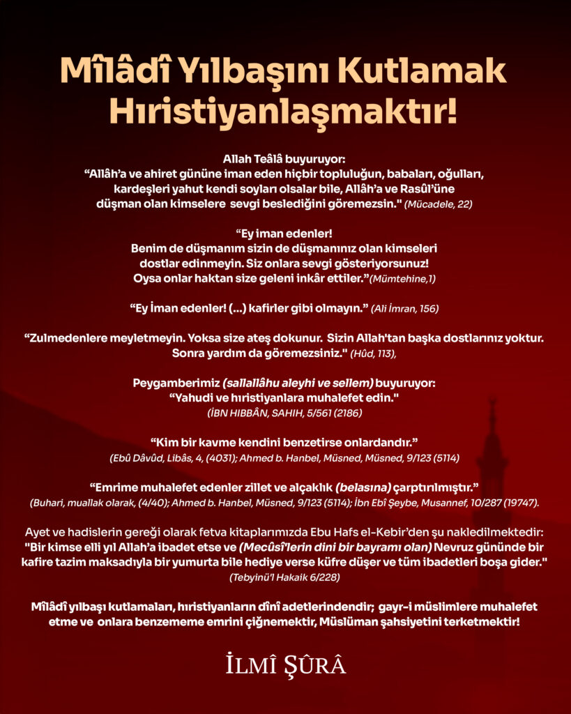 Kişi, sadece gayr-i müslimlere bir şekilde benzemeyle kâfir olmaz, fakat itikadî dönüşümler olmadan da bu benzeme ortaya çıkmaz. Bir diğer ifadeyle itikadî ve düşüncedeki bozulma sebep, benzeme, yozlaşma ve şahsiyetsizleşme sonuçtur. Dolayısıyla milâdî yılbaşını kutlamak gayr-i müslimlere meyletmektir, kendini benzetmektir; onların sevgisini gönüllere işlemektir; kutsallarının toplumsal değerini arttırmaktır. Milâdî yılbaşını kutlamak Noel’i kutlayanları taklit etmektir, büyük/ileri/üstün kabul etmektir, takdis etmektir, küfrün gücüne güç katmaktır.